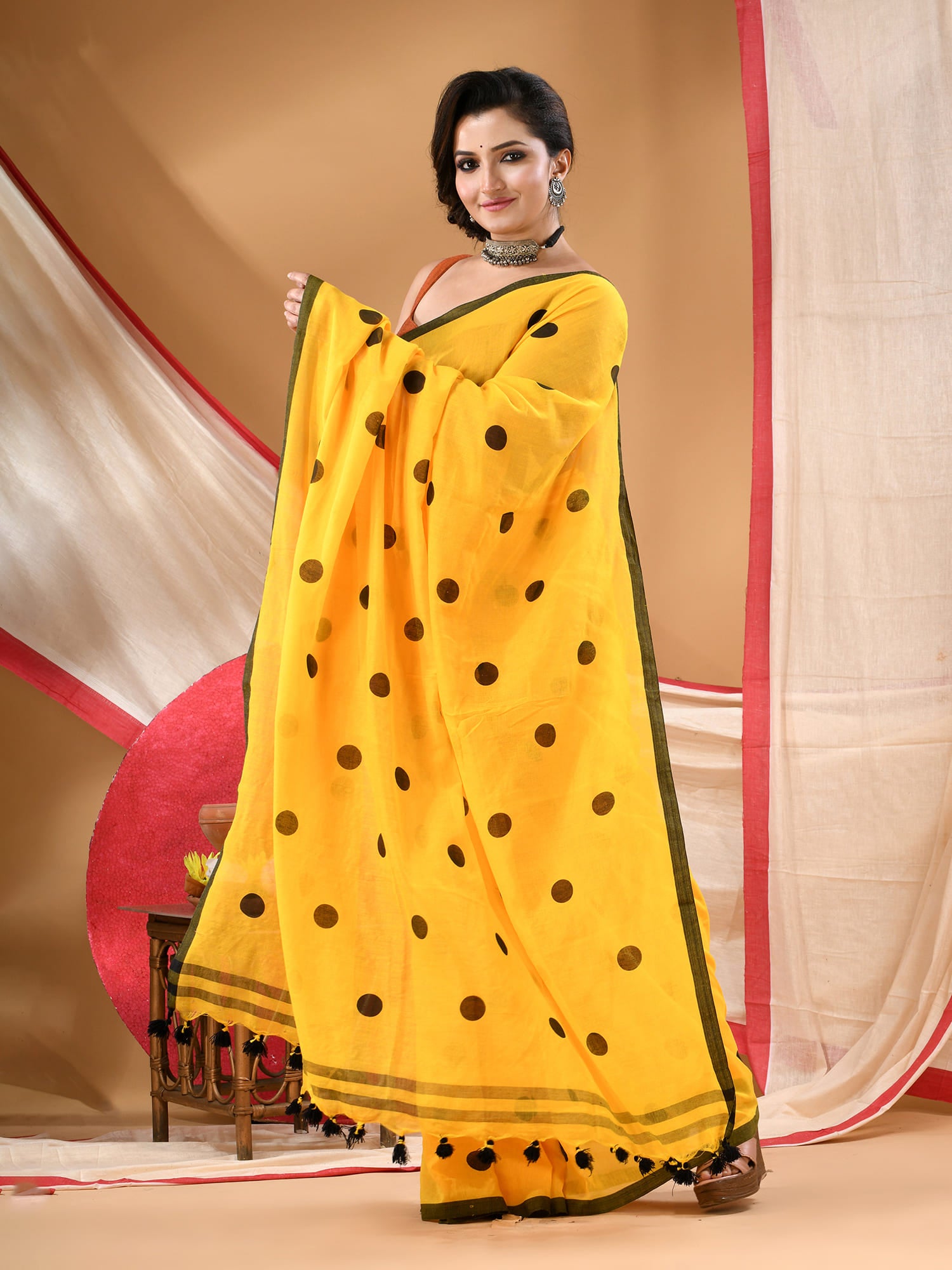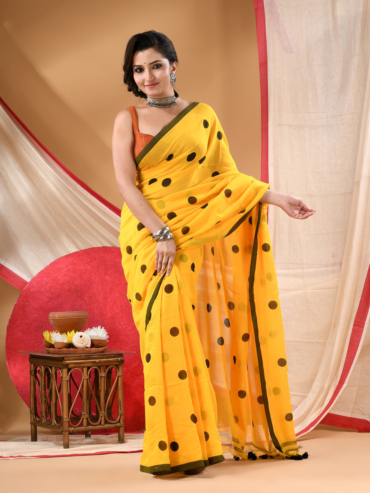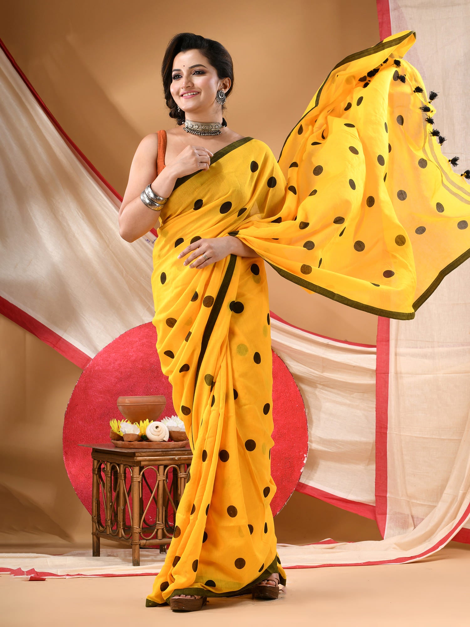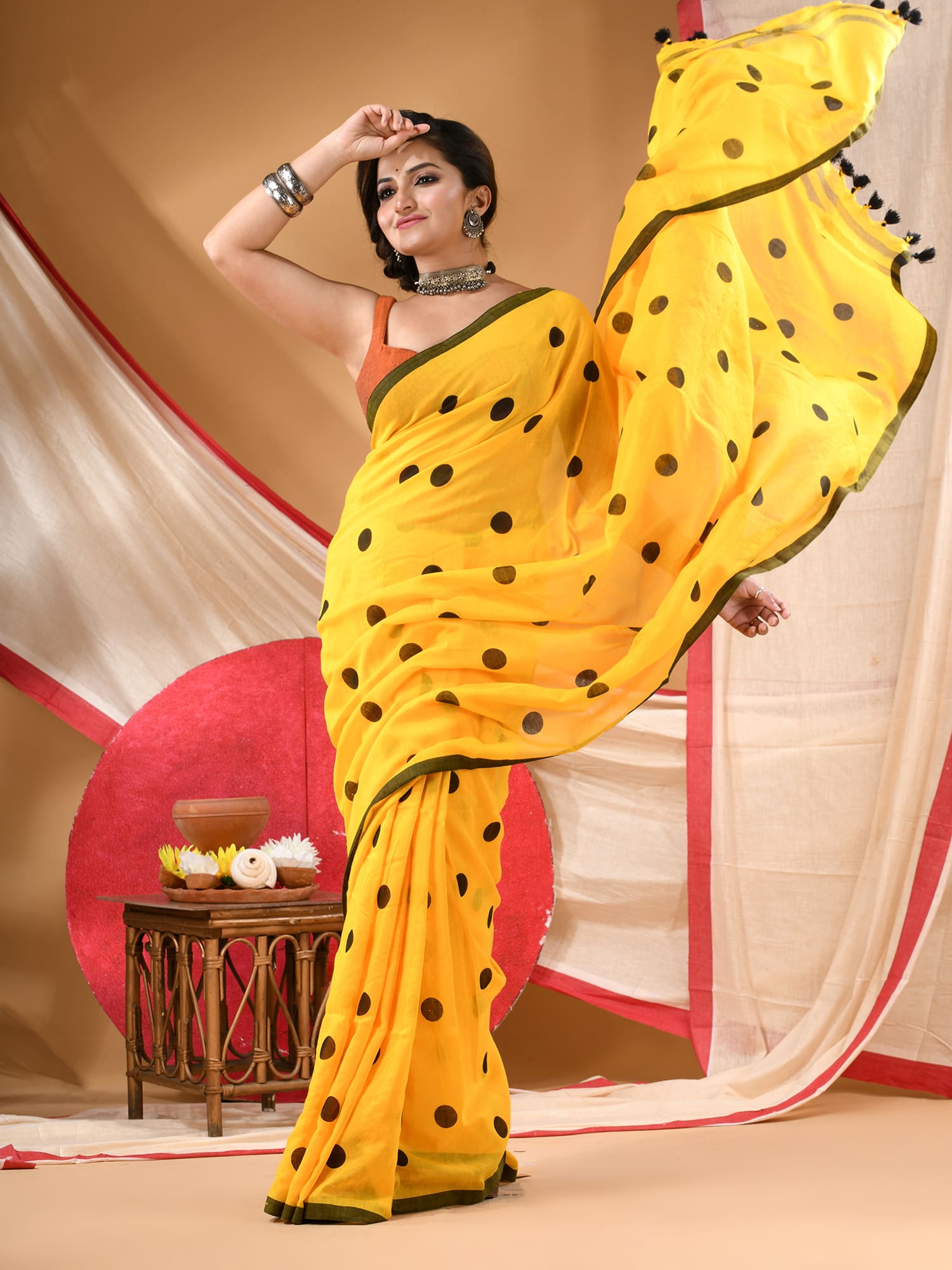 Women cotton handloom mulmul cotton sarees mul cotton sarees for women latest, Nazakat design batik print bandhani malmal linen office daily, party, wear sarees for women (Yellow Black)