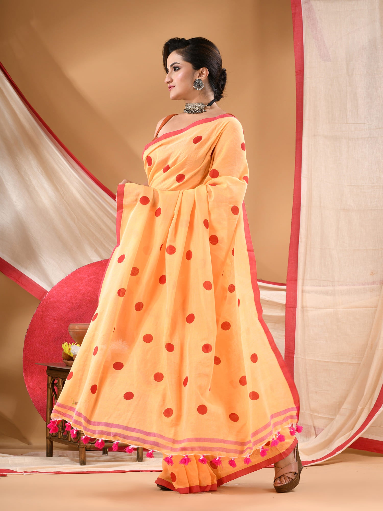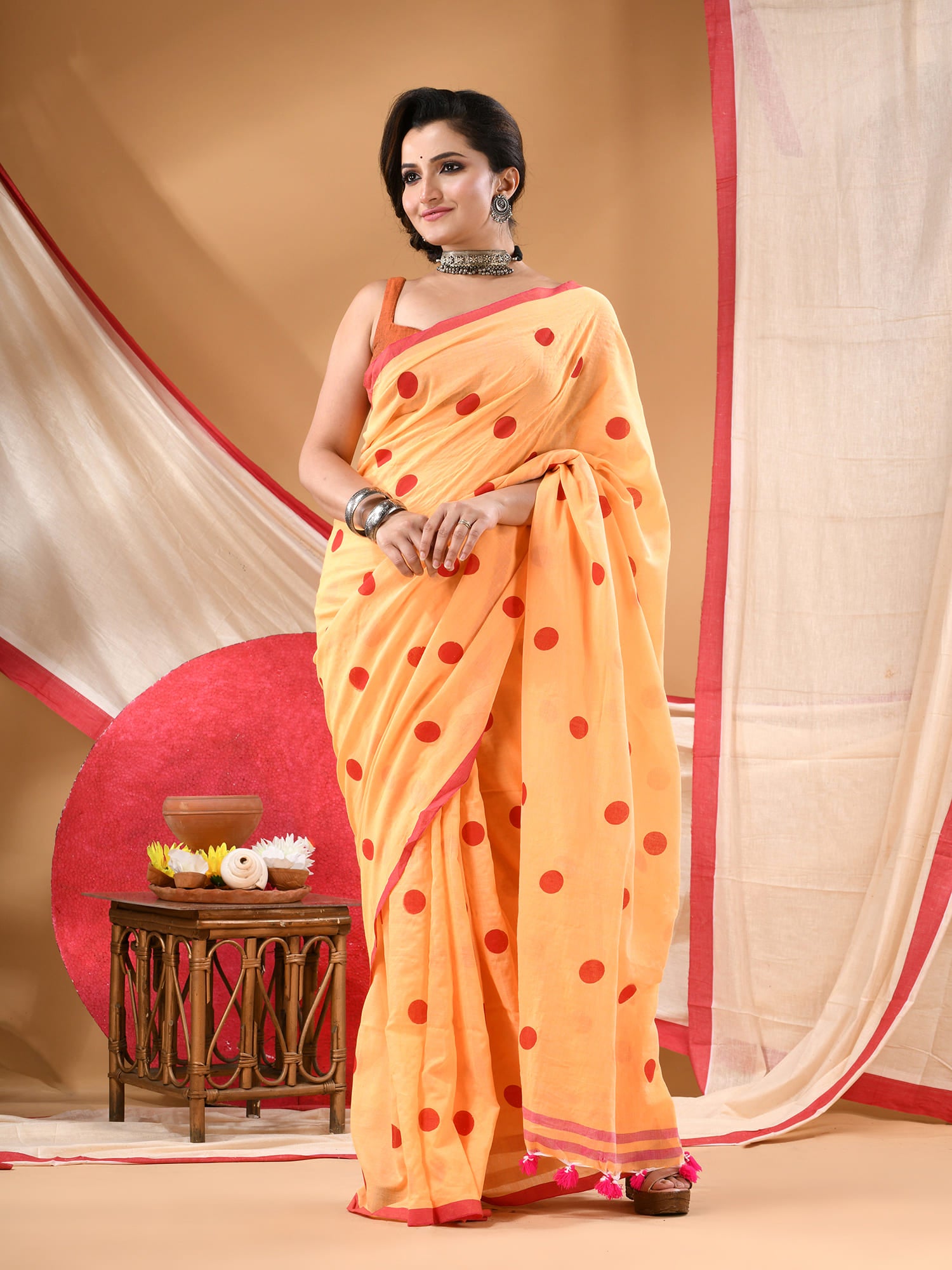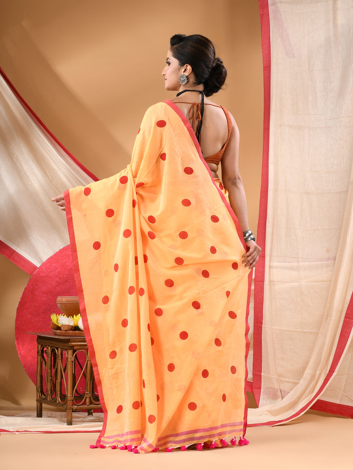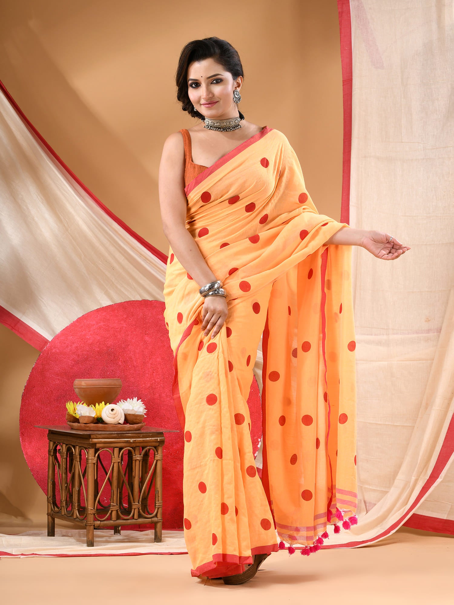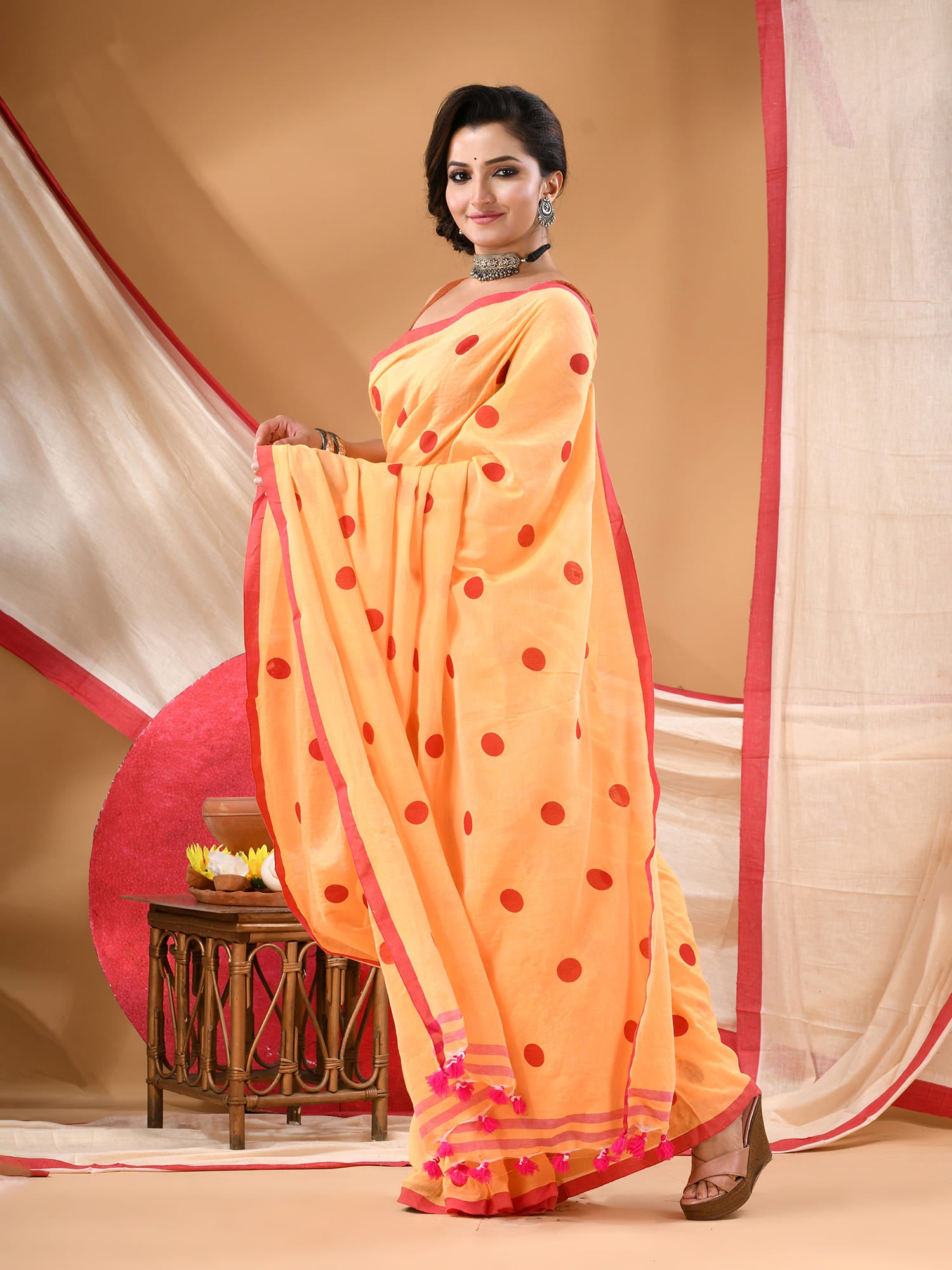 Women cotton handloom mulmul cotton sarees mul cotton sarees for women latest, Nazakat design batik print bandhani malmal linen office daily, party, wear sarees for women (Yellow Red)