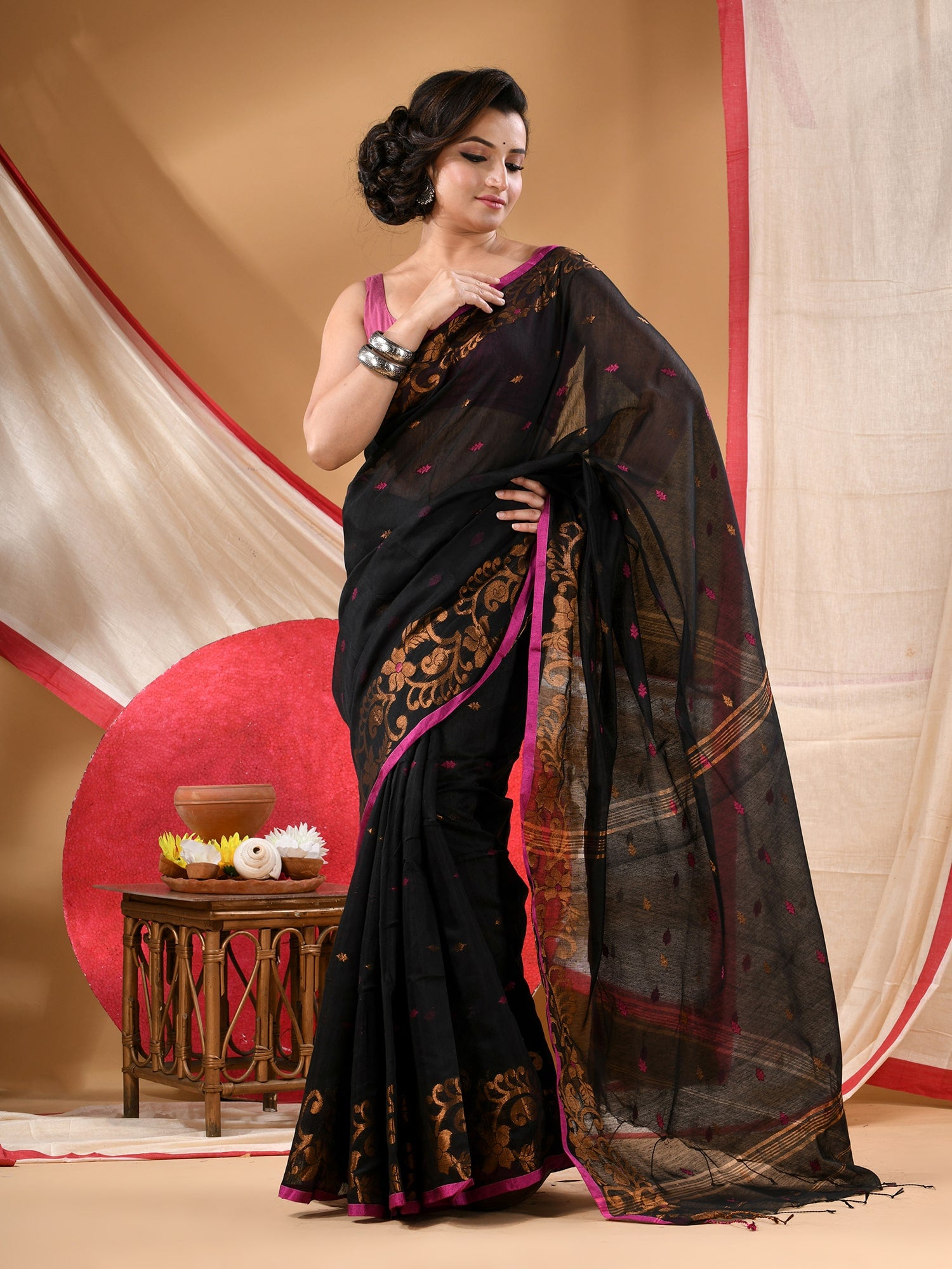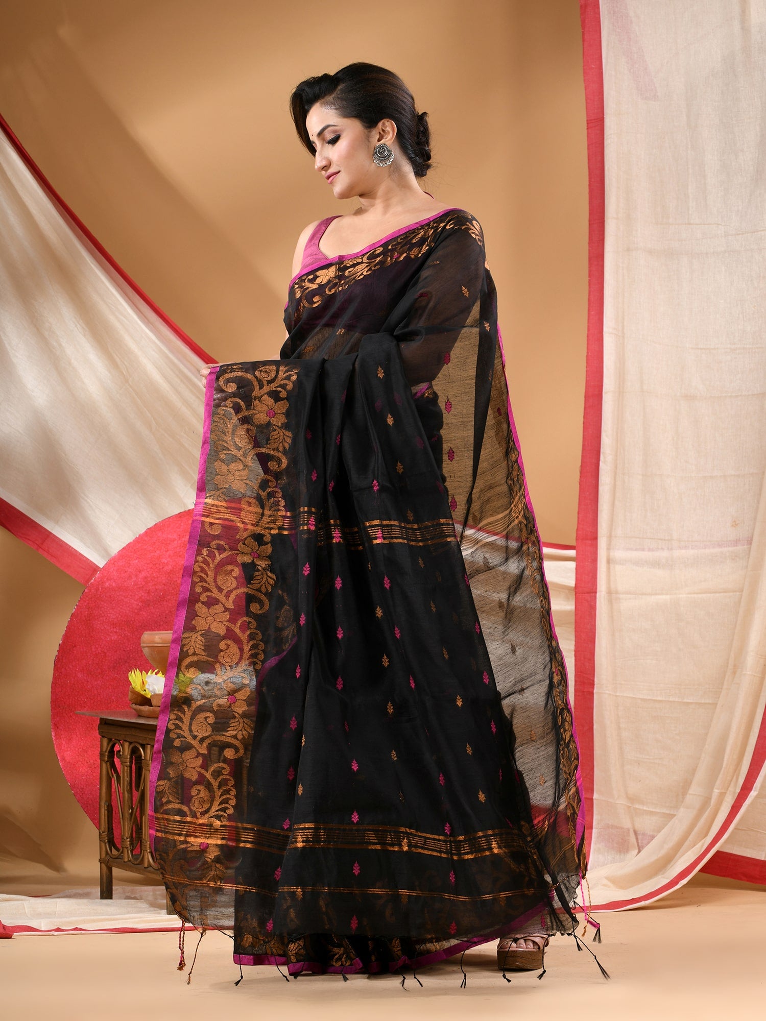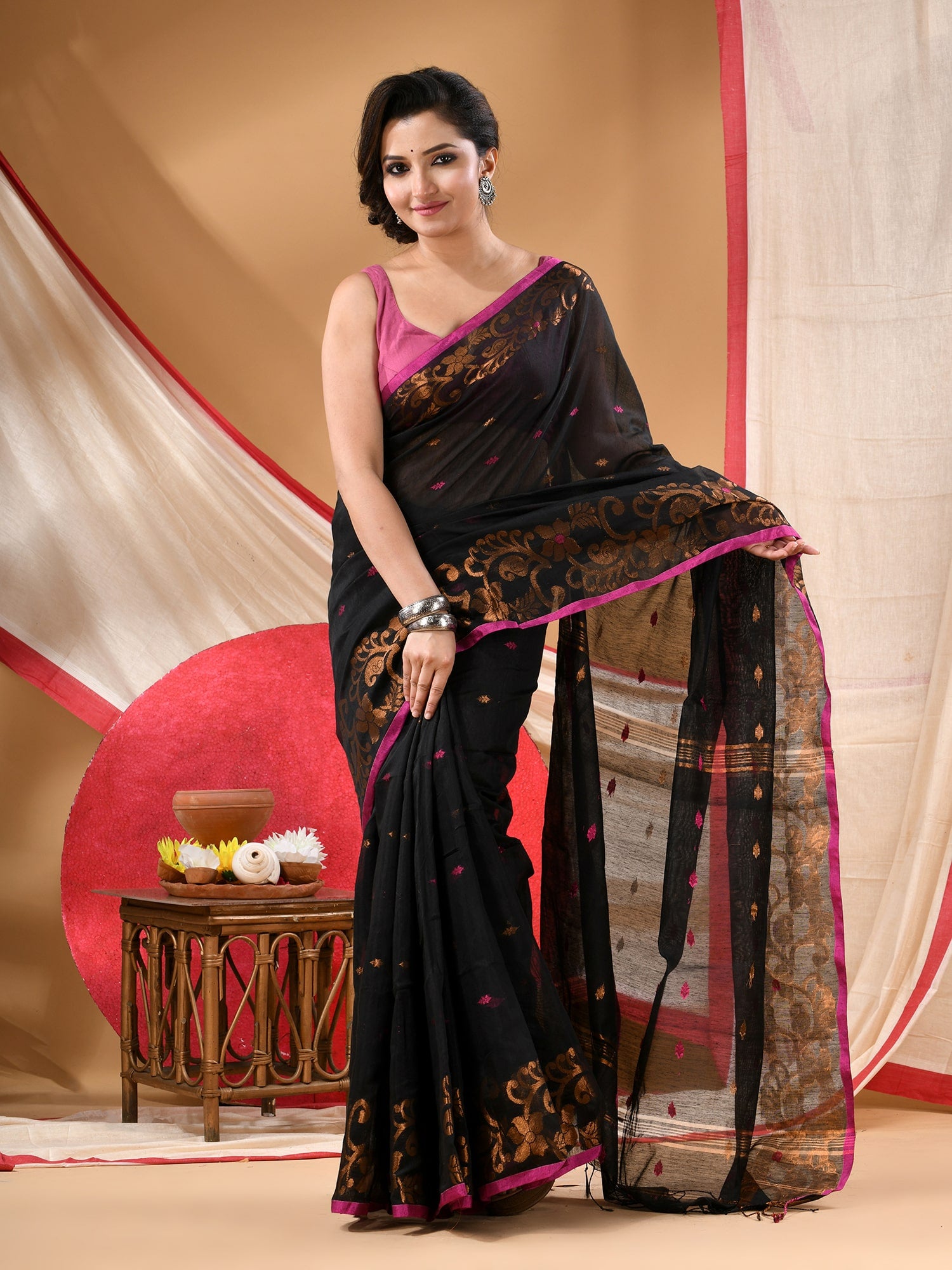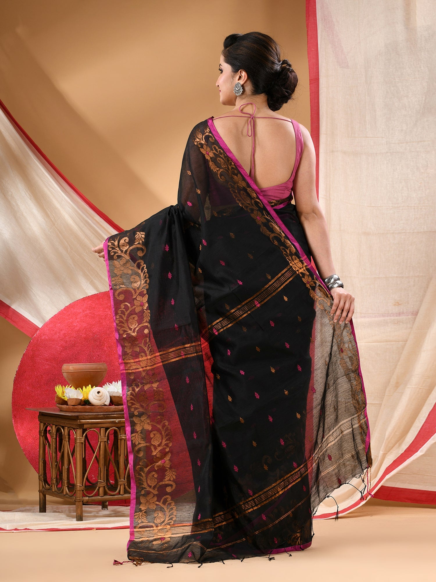 Women cotton silk tant handloom saree mysore party, wear sarees latest, design wedding, banarasi design georgette saree soft silk cotton MidNight Zari sarees for women (Black)