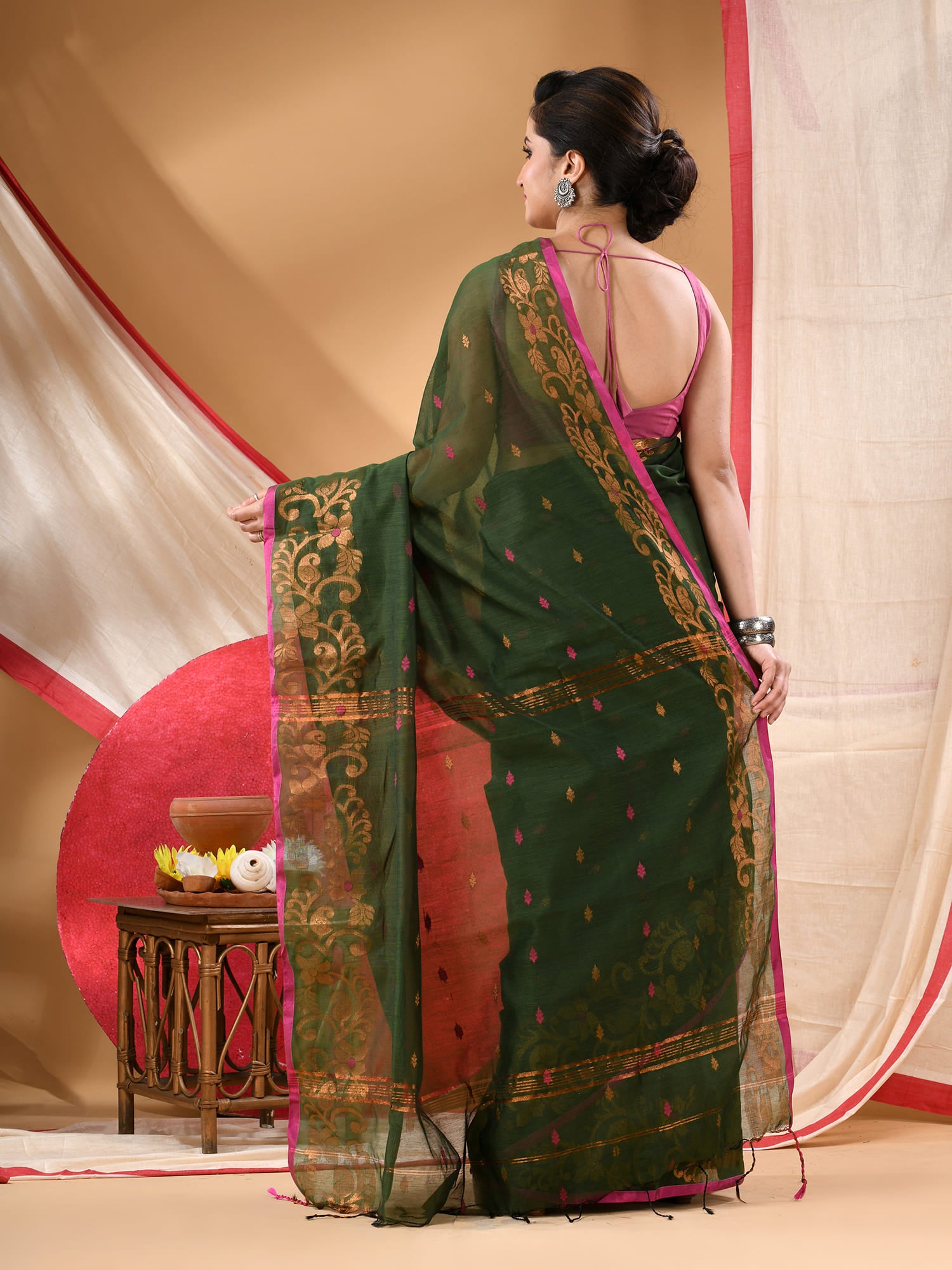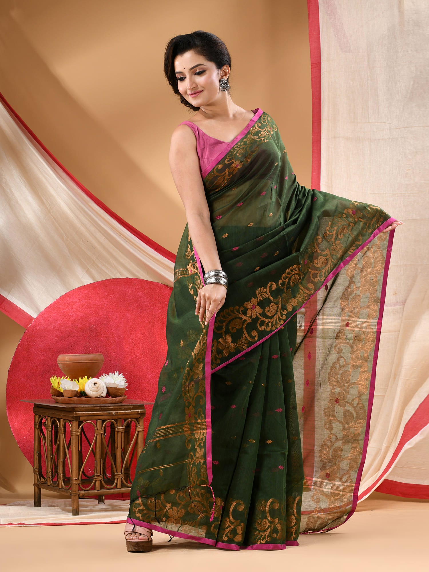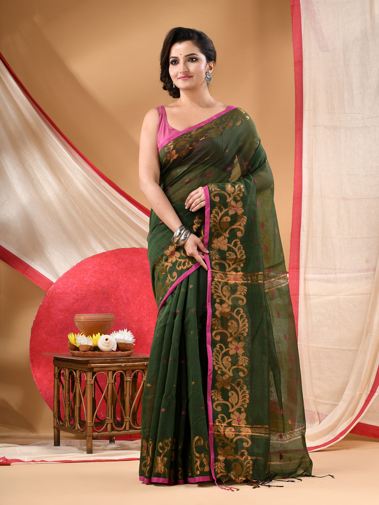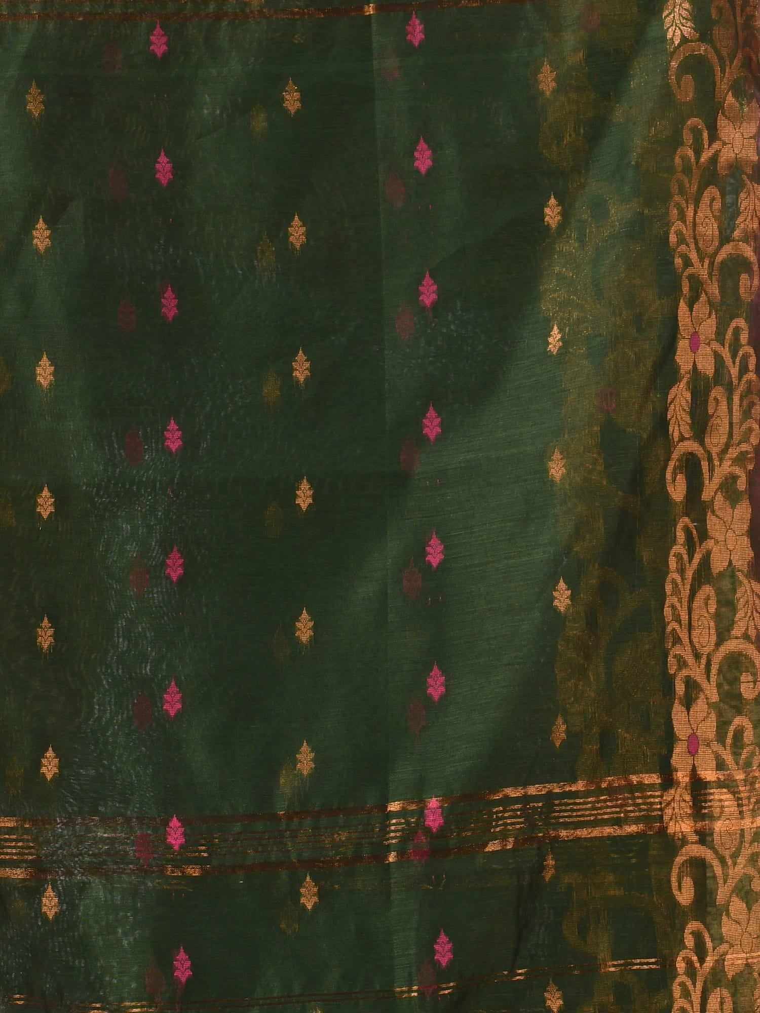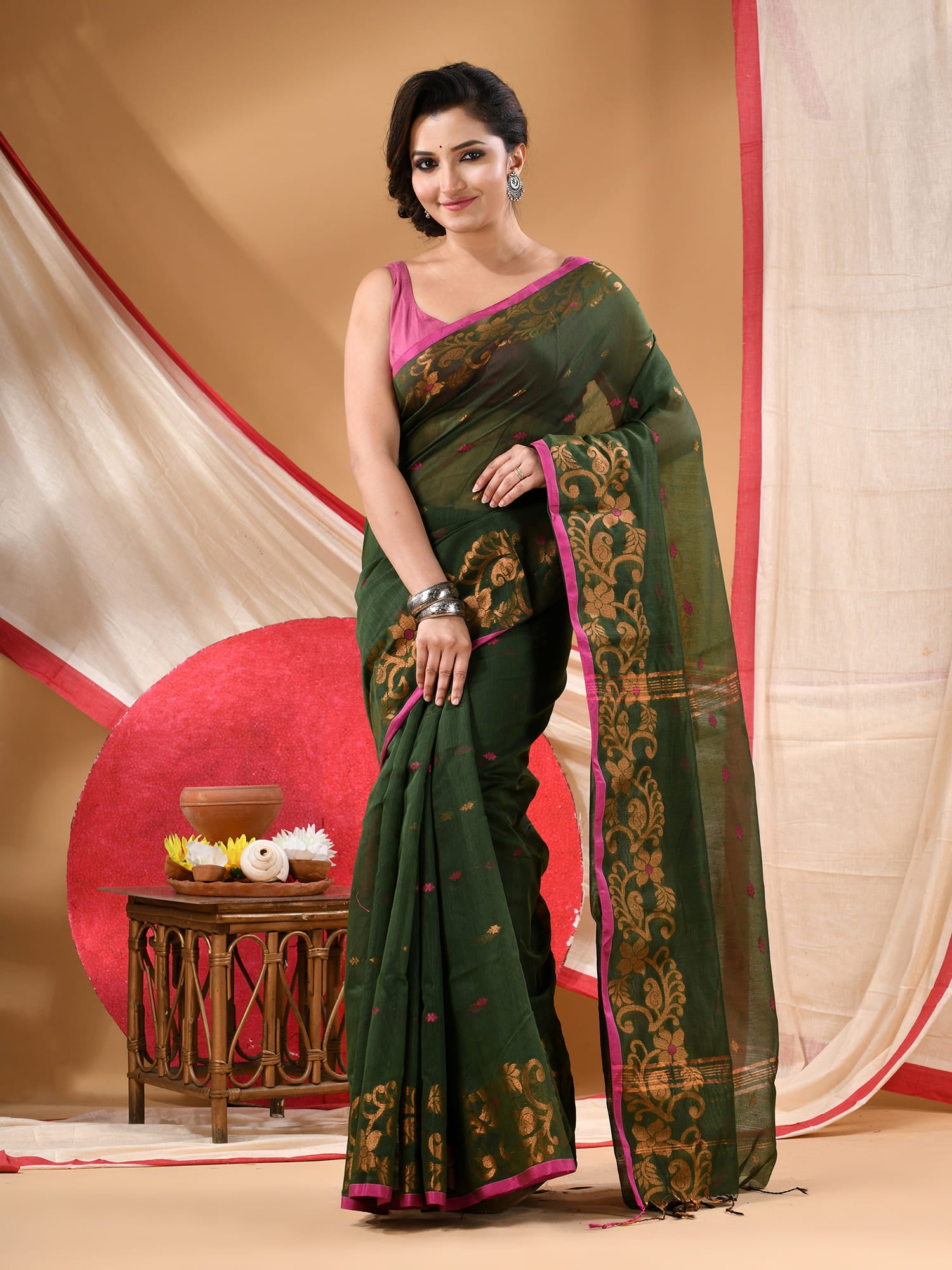 Women cotton silk tant handloom saree mysore party, wear sarees latest, design wedding, banarasi design georgette saree soft silk cotton MidNight Zari sarees for women (Dark Green)