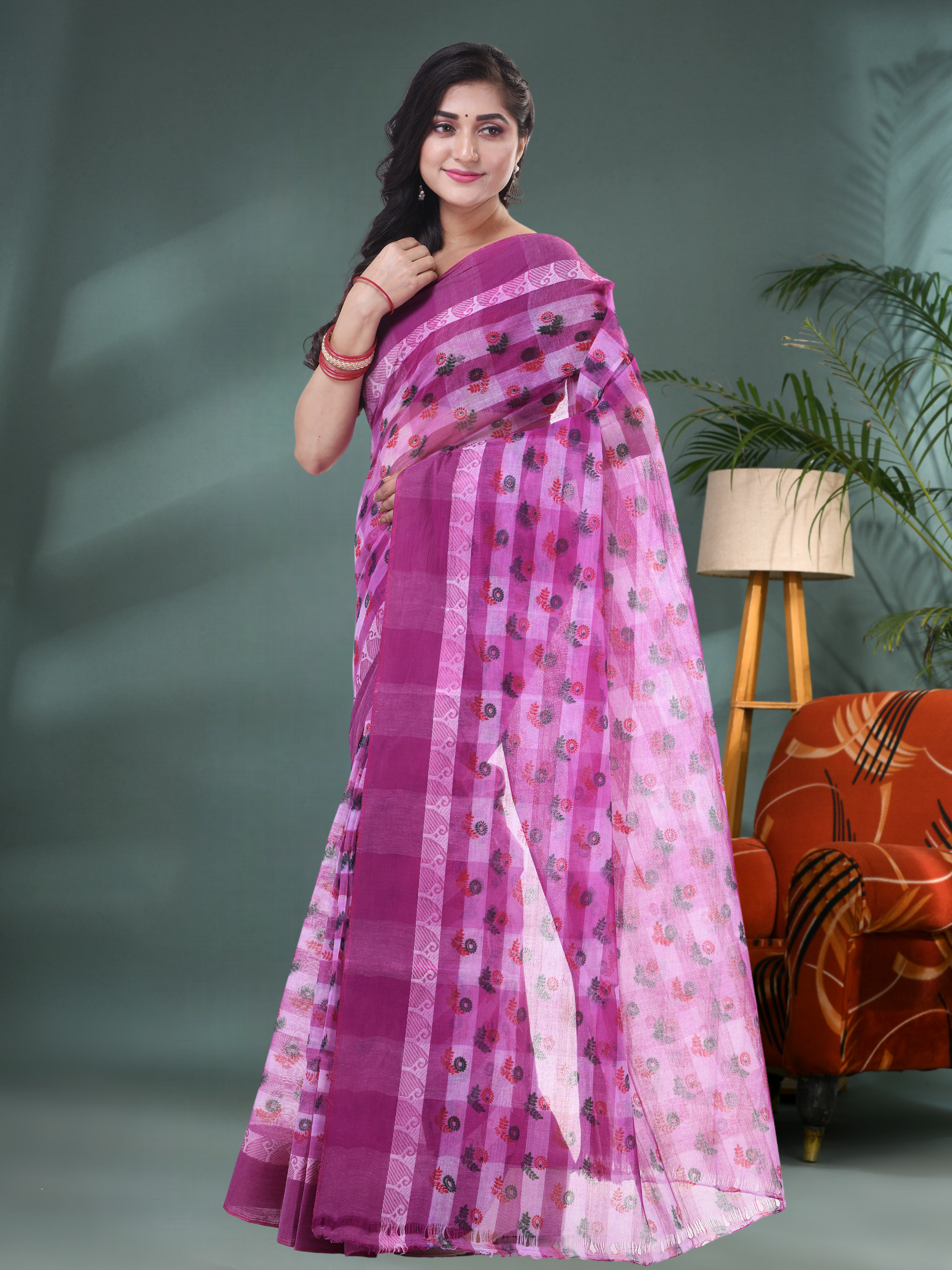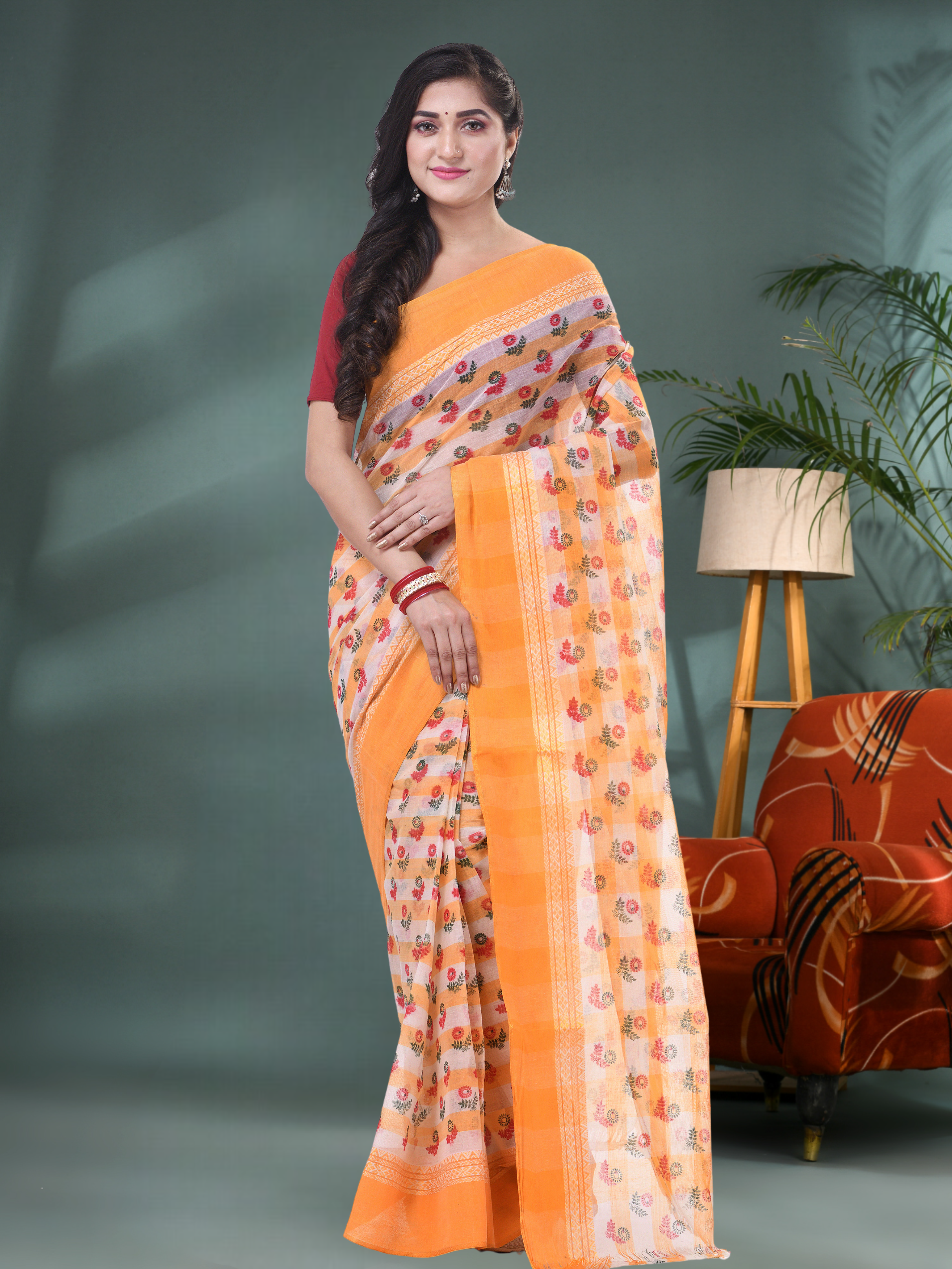 Women’s Bengal Tant Banphul Print Pure Handloom Cotton Saree – Without Blouse Piece