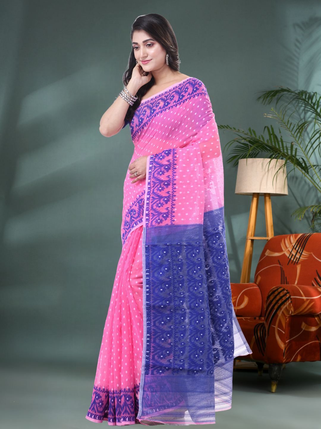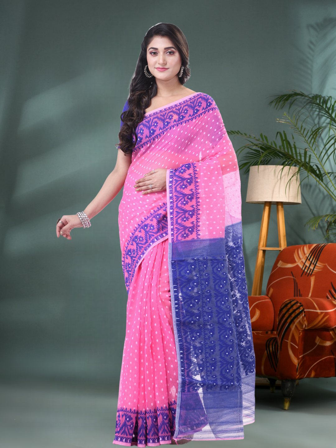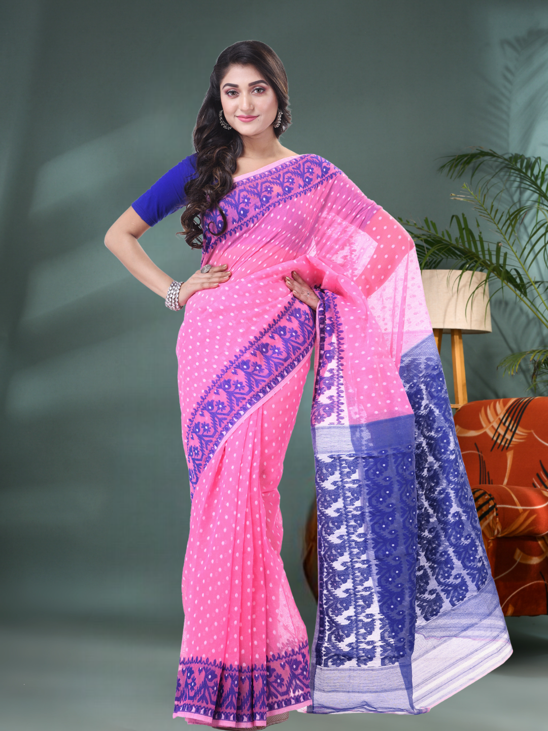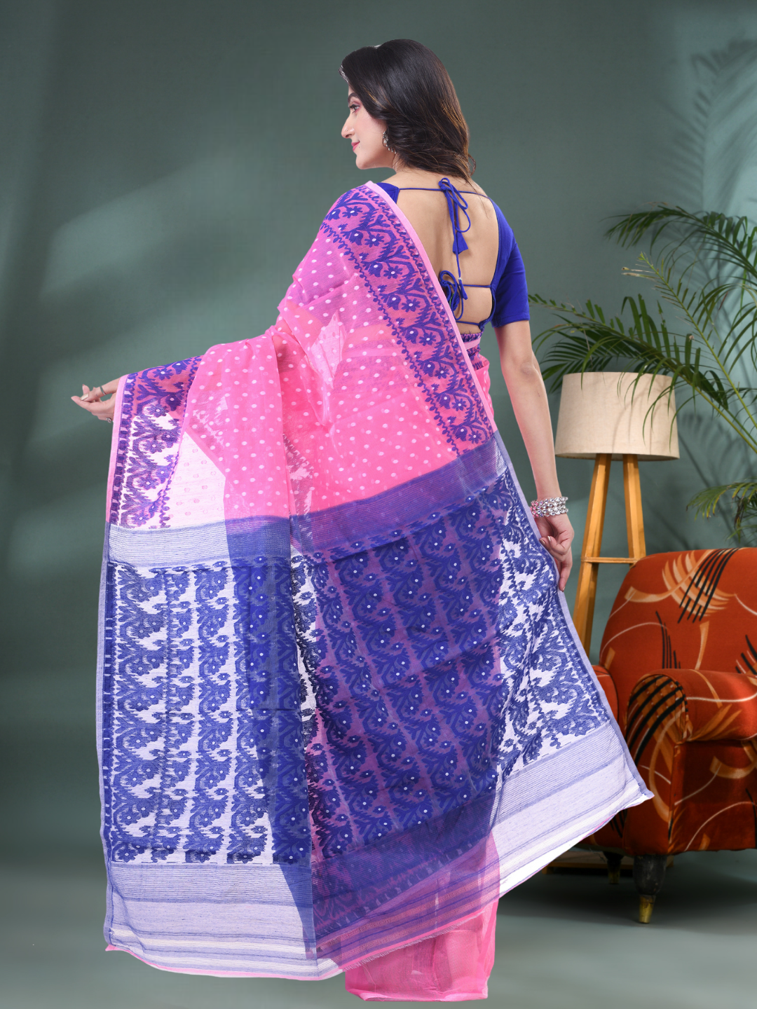 Available in Pink and Blue, this saree does not include a blouse piece, making it ideal for those who love to pair it with their own styles. From muslin-inspired weaving to fine resham detailing, this is a perfect pick for lovers of original Jamdani sarees, whether you're searching online or offline.