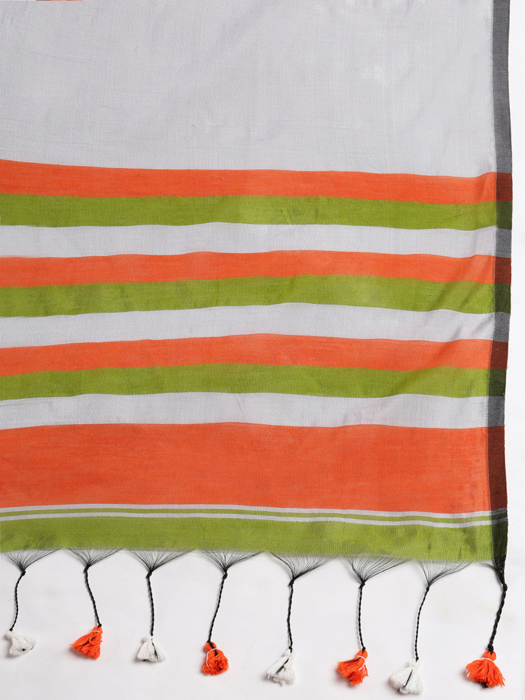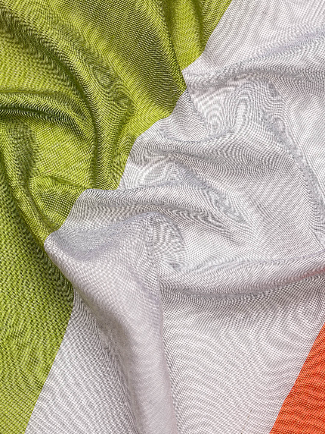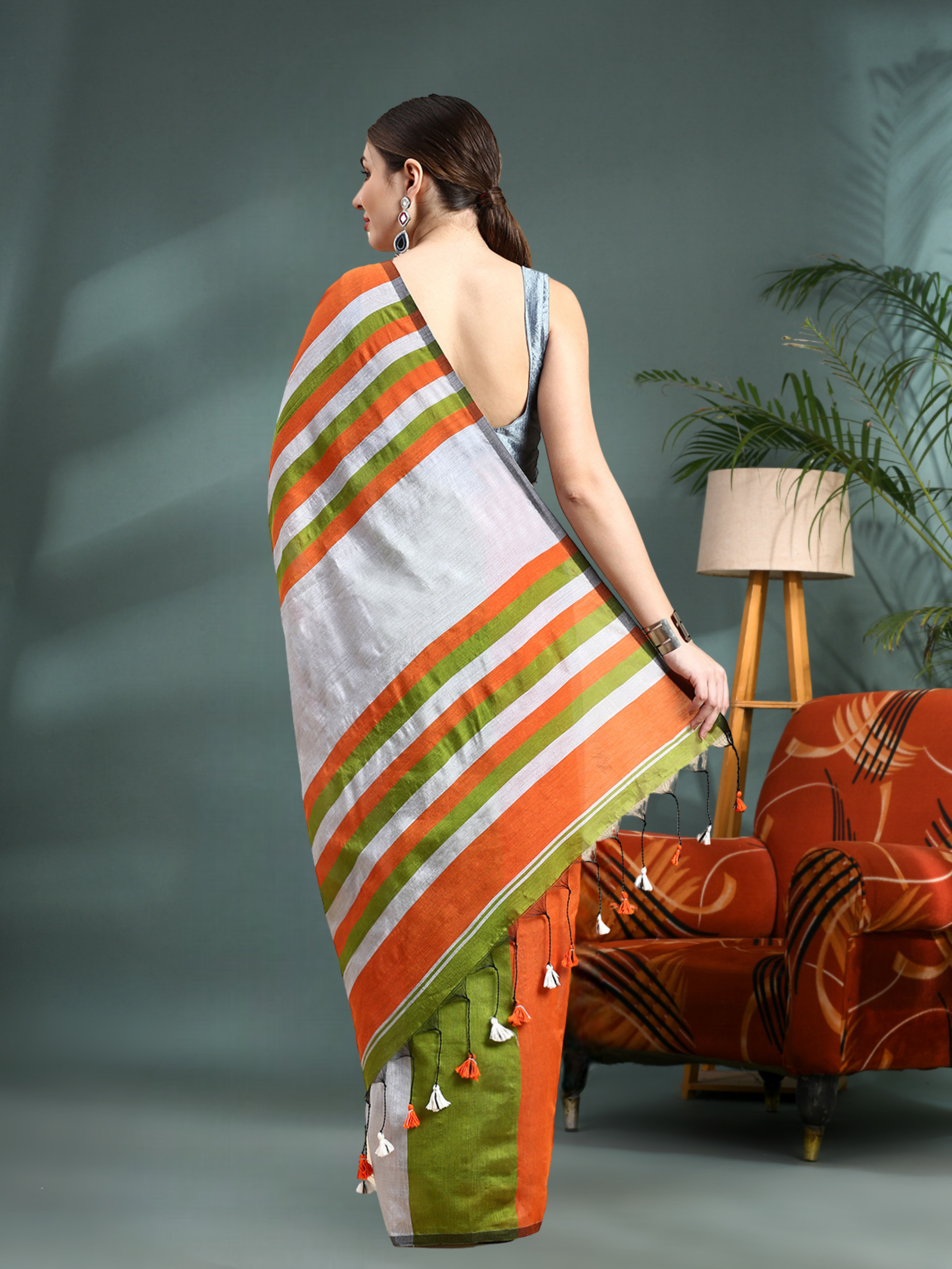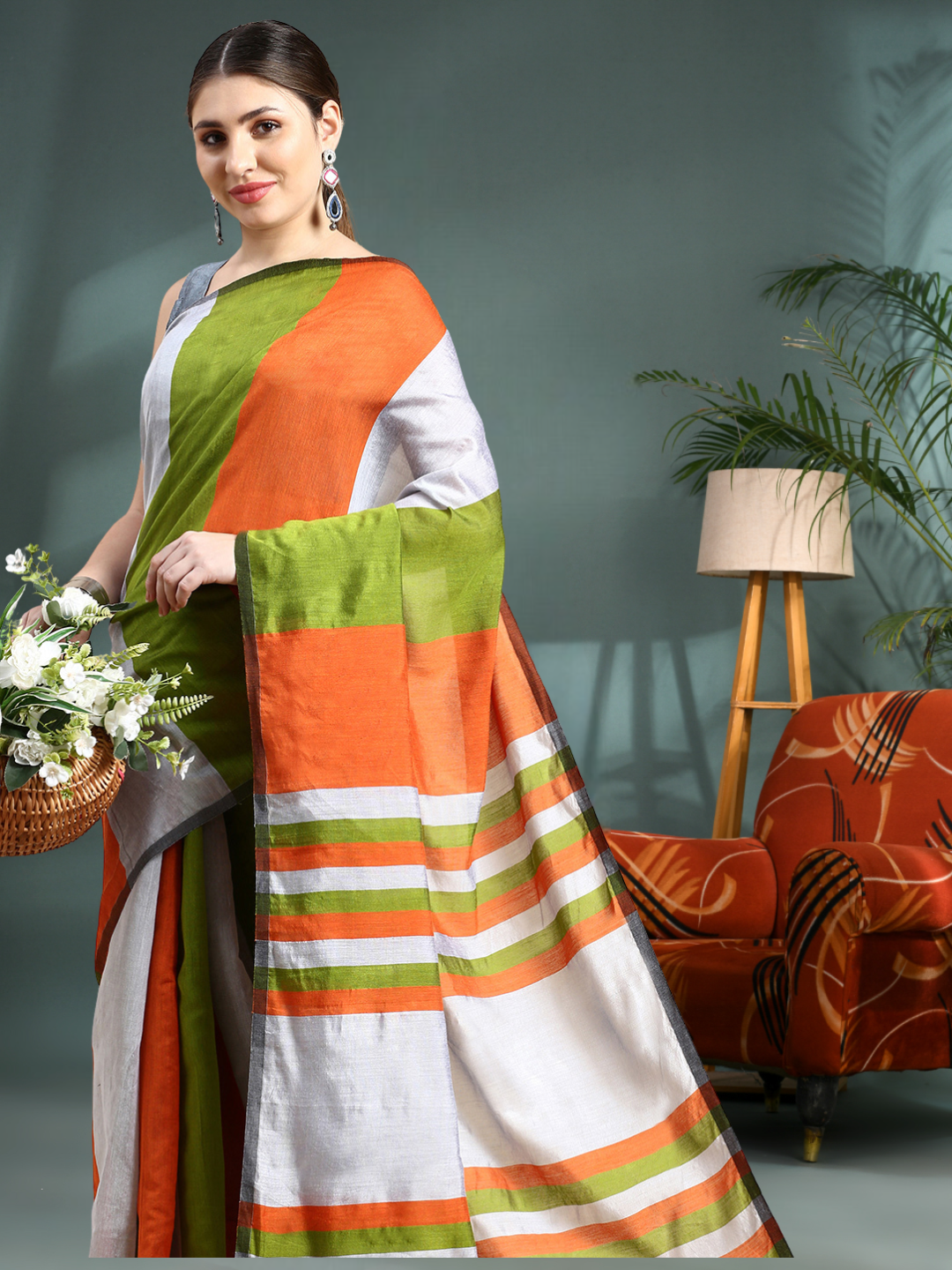 Women's Gitcha Cotton Silk Tri Color Saree with Blouse (Orange Silver Green)
