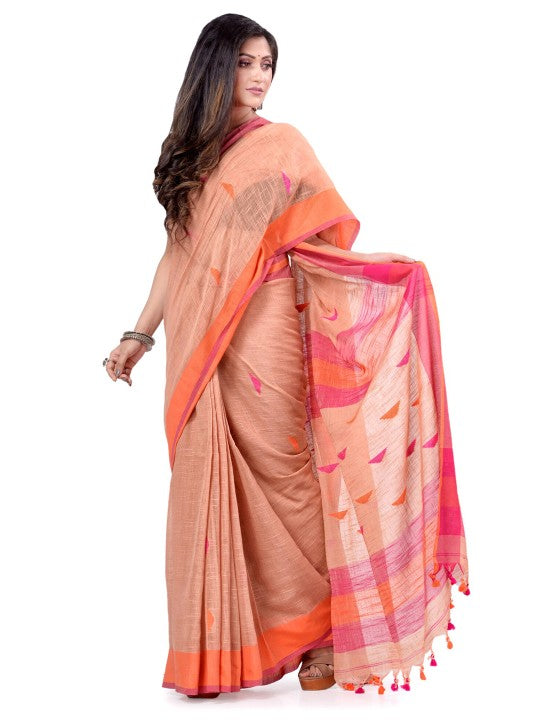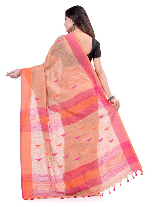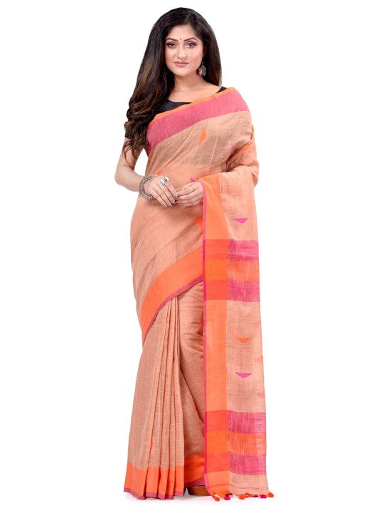 Cream-coloured and orange taant saree with a woven design and solid border. This saree includes an unstitched blouse piece. Kindly refer to the image of the blouse piece for its actual appearance, as the model's blouse may be for styling purposes only.