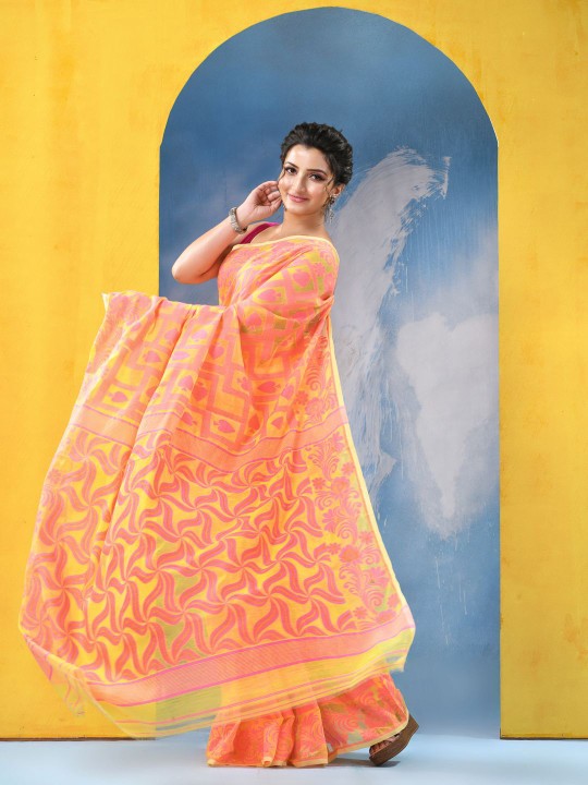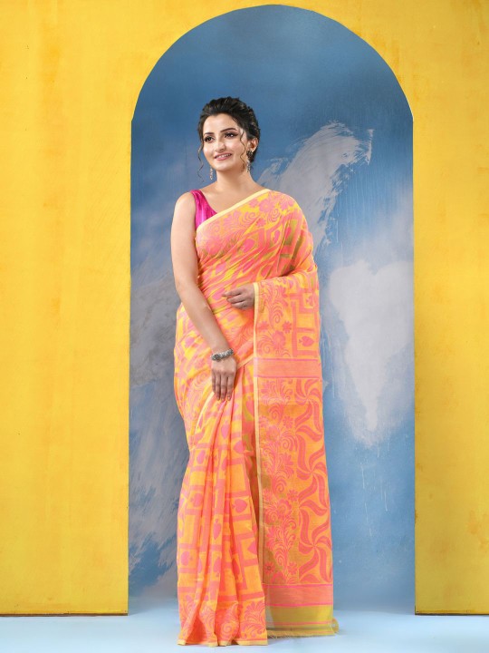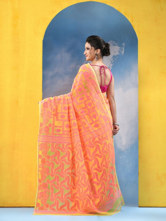 | Design Details | Yellow and Pink Jamdani Saree, Woven Design with Solid Border |